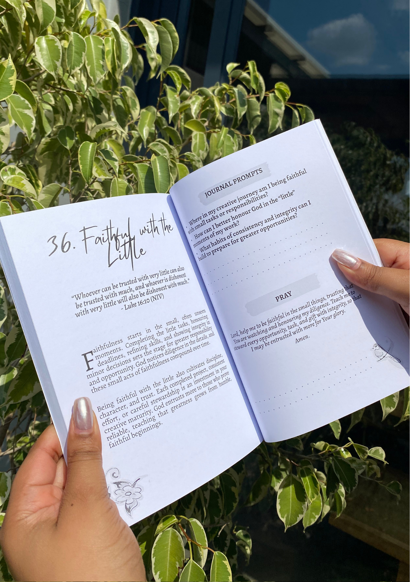 The Faithful Maker is a 40-day devotional journal designed for artists, dreamers, and creators who want to reconnect with their God-given creativity. Blending scripture, reflection, prayer, and journaling prompts, this guide helps you navigate seasons of disappointment, cultivate courage, and steward the gifts God has placed in your hands.